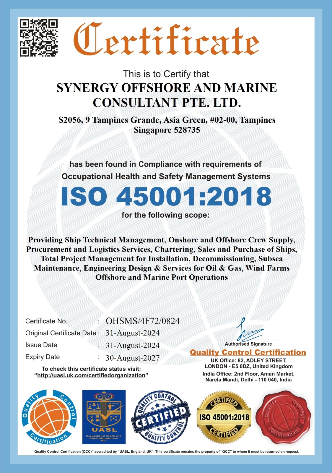 SYNERGY OFFSHORE AND MARINE CONSULTANT PTE LTD .(SOMCL) we always strive to develop our resources in challenging circumstances and strengthen our capabilities to actively meet the requirements of our clients. The achievement of the ISO 9001:2015 certificates acknowledge the high quality standards we abide by.